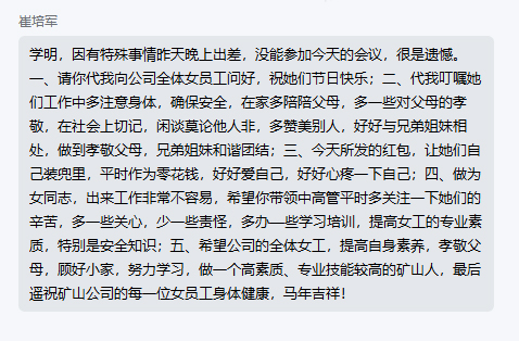 He even sent a message to all female employees, hoping that we continue to learn, improve skills, become a high-quality, professional ability of mine people, and finally wish all female employees good health and good luck in the Year of the Horse.